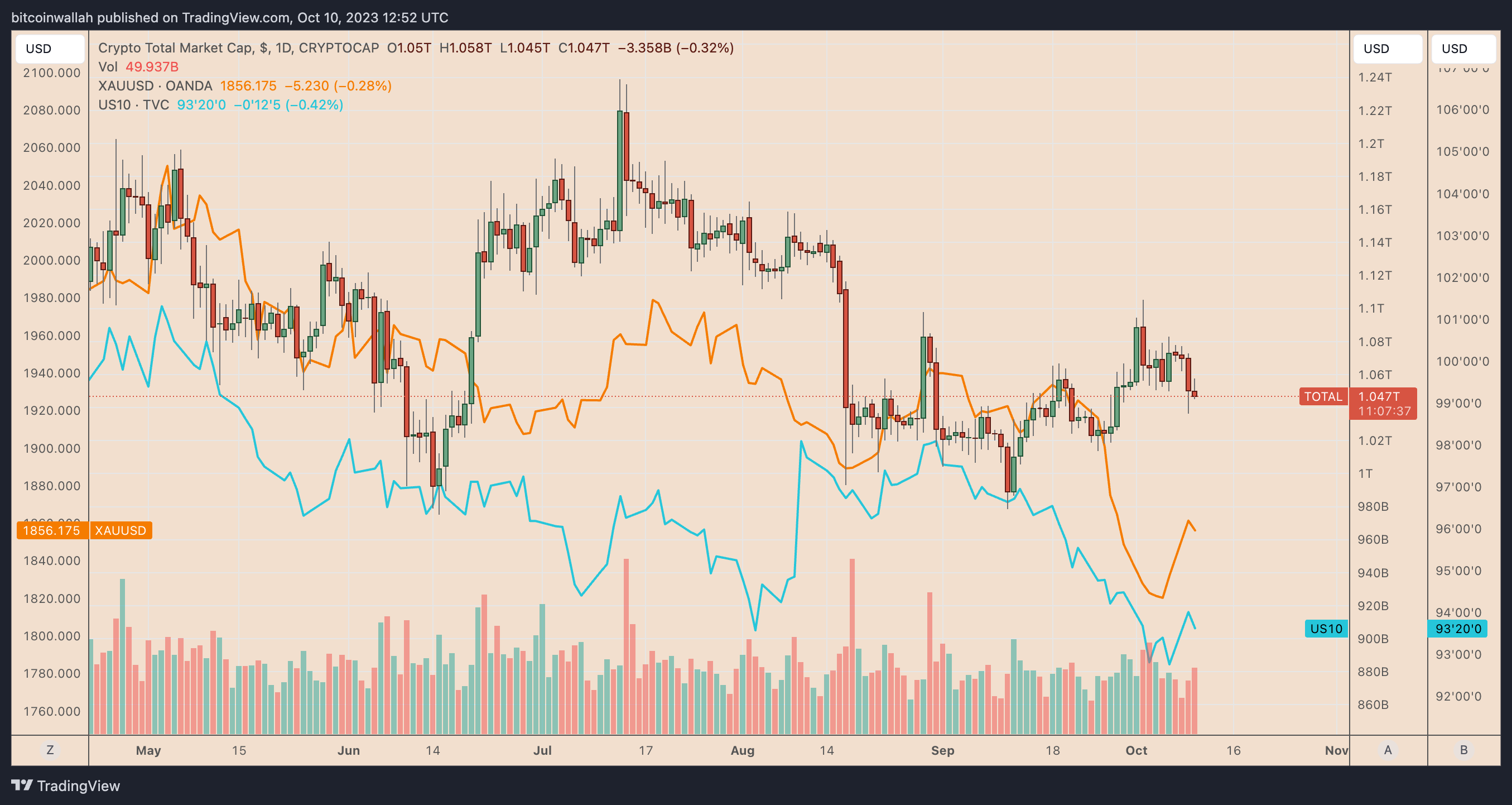 Crypto market vs. US 10-year Treasury and gold daily performance chart. Source: TradingView