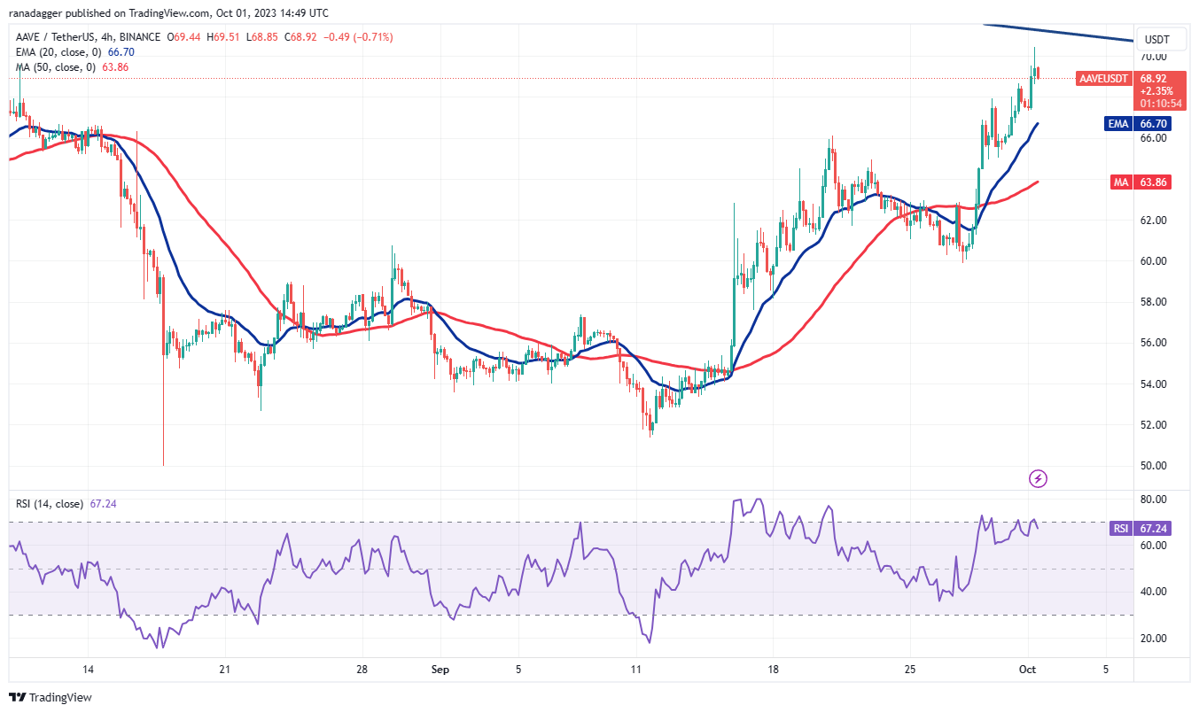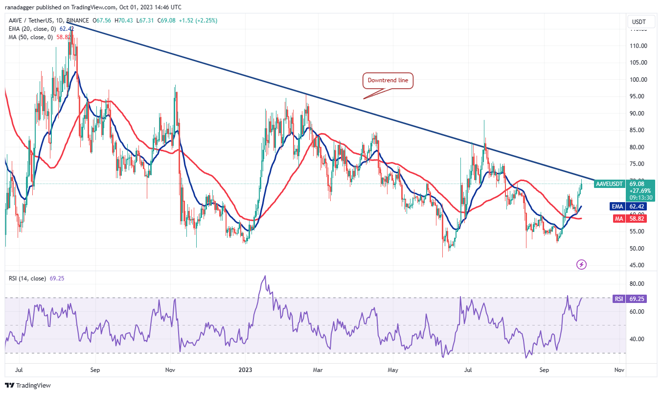 Aave (AAVE) is trying to break above the long-term downtrend line, indicating a potential trend change. The rebound off the 20-day EMA ($62.42) on Sep. 28 indicates a change in sentiment from selling on rallies to buying on dips.