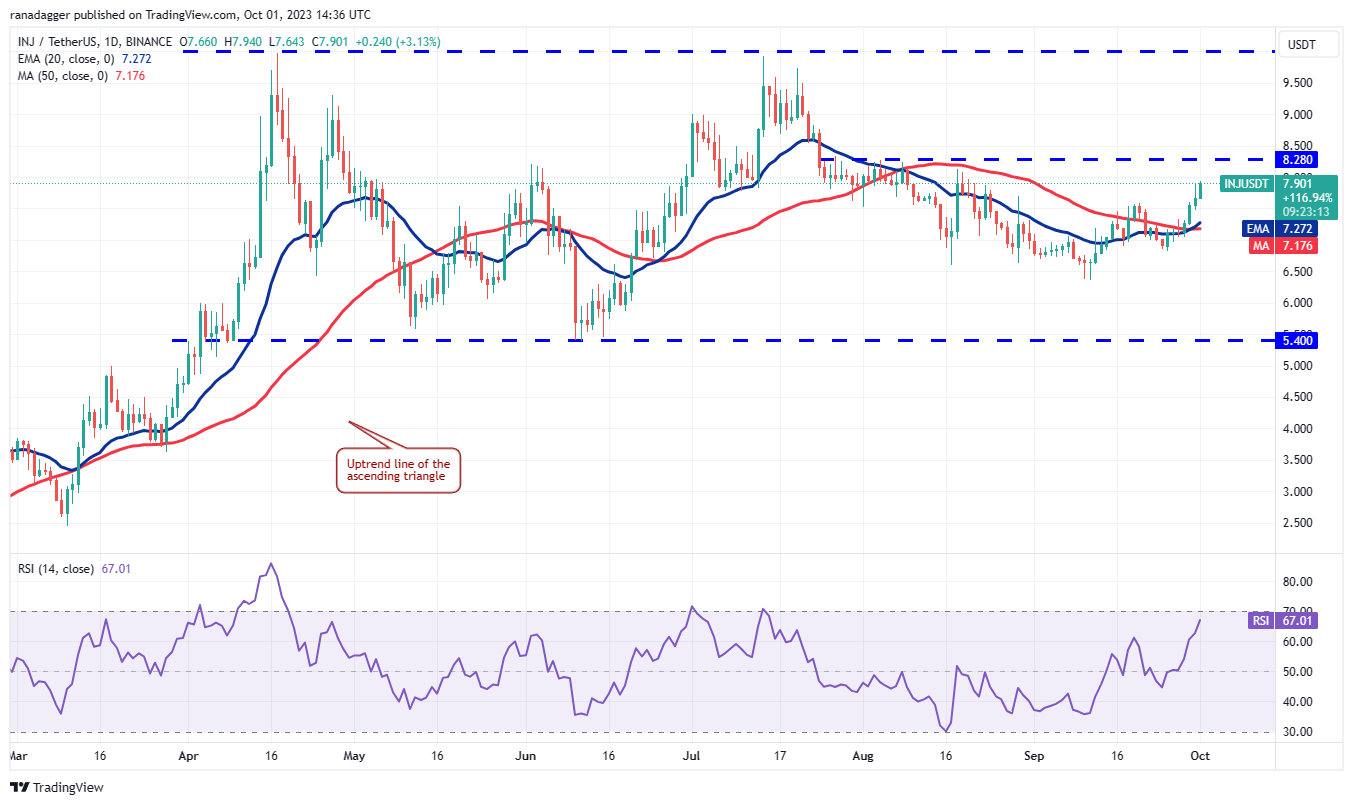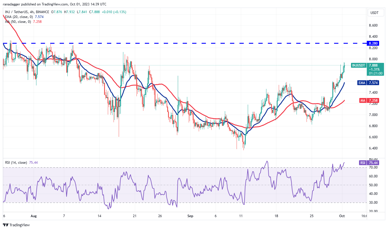 The moving averages have completed a bullish crossover and the RSI is in positive territory, indicating that bulls have the upper hand. The INJ/USDT pair could first rise to $8.28 where the bears may mount a strong resistance. If bulls overcome this barrier, the pair could pick up momentum and soar toward $10.