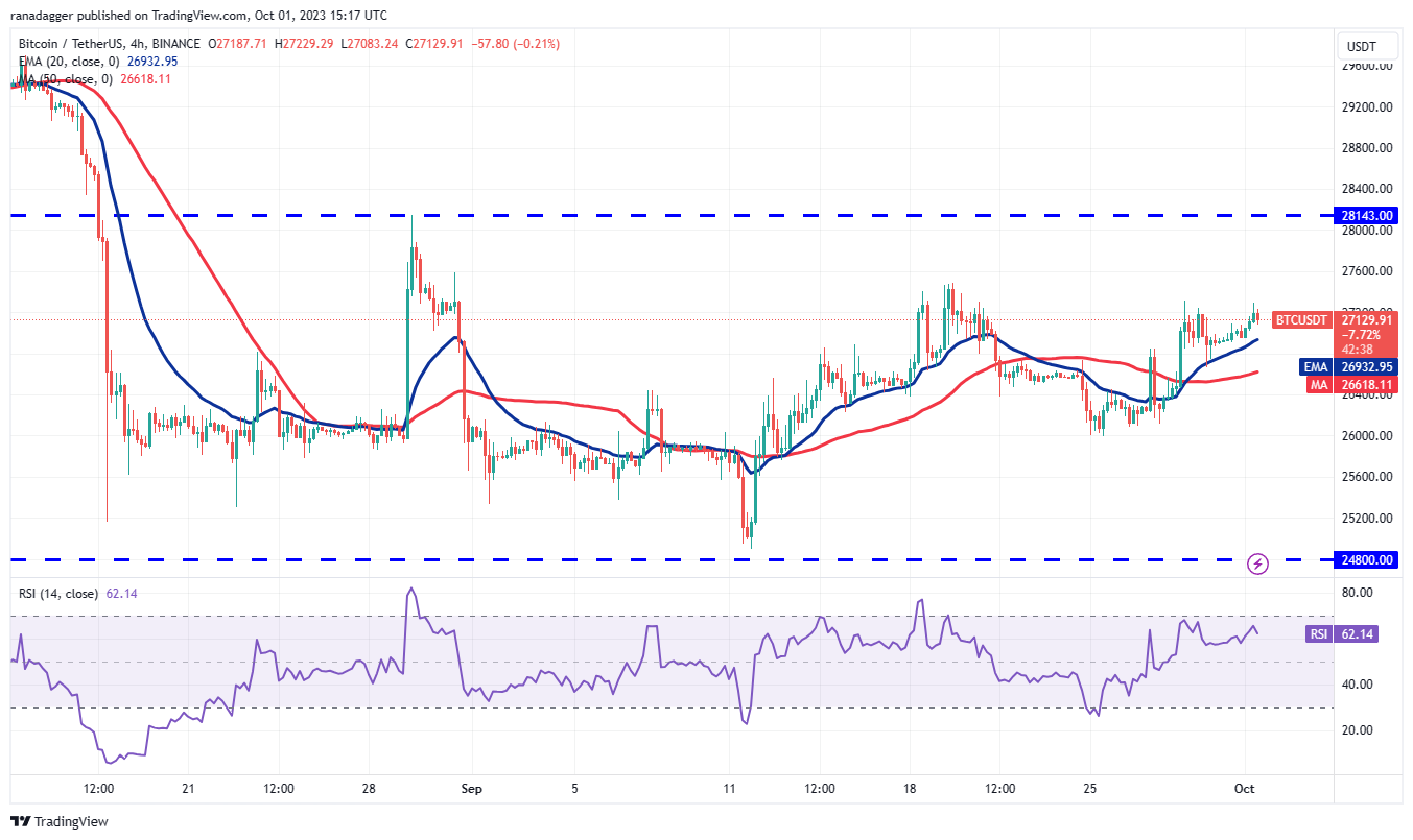 The 4-hour chart shows that the pair is taking support at the 20-EMA. This indicates that the bulls are trying to take charge. However, the bears are unlikely to give up easily and they will try to halt the recovery in the zone between $27,300 and $27,500. The sellers will then have to yank the price below the 20-EMA to seize control.
