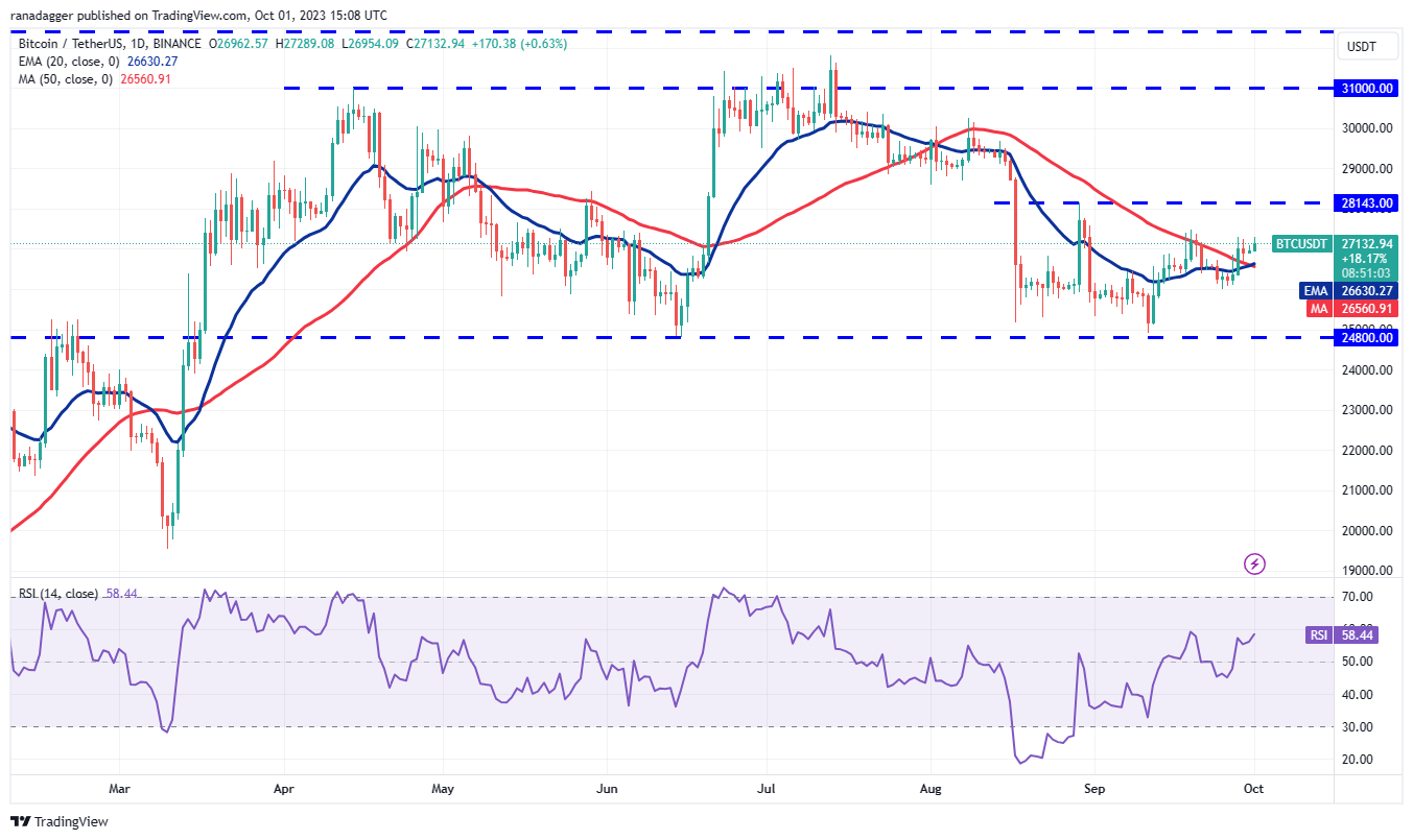 If the price turns down sharply from $28,143, the pair could retest the 20-day exponential moving average ($26,630). A strong bounce off this level could kick the price above $28,143. The pair may subsequently climb to $30,000.