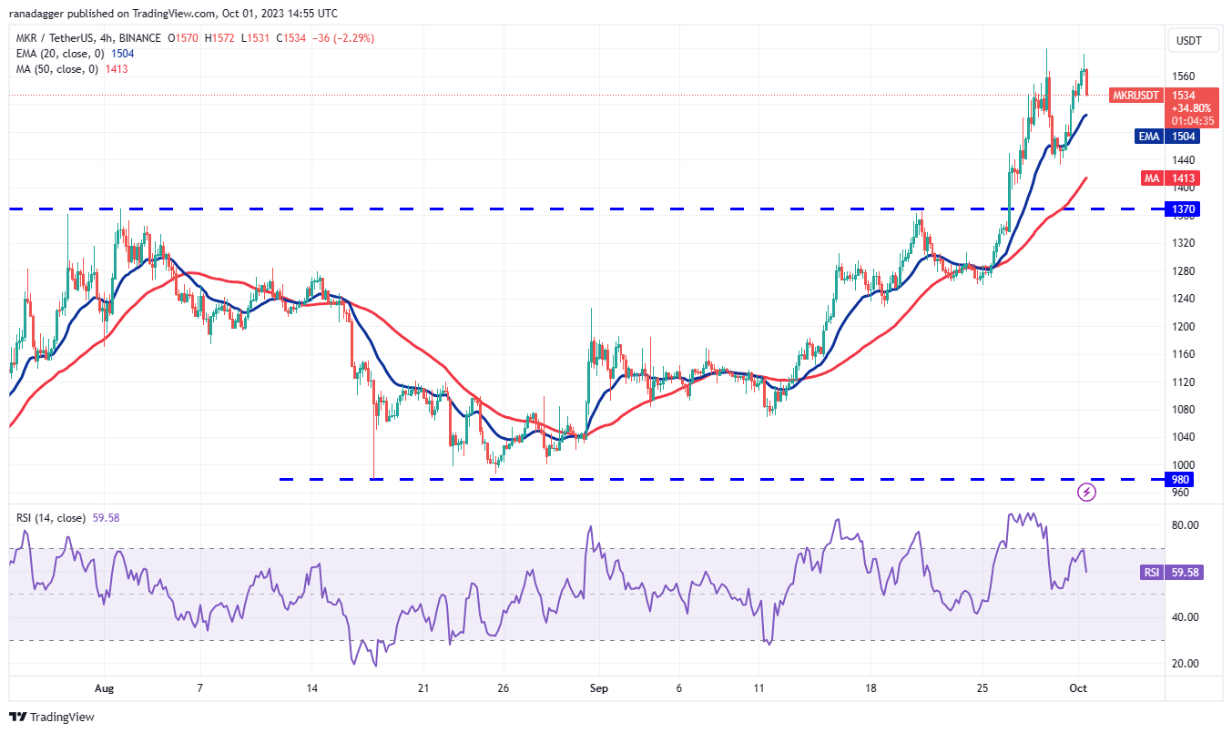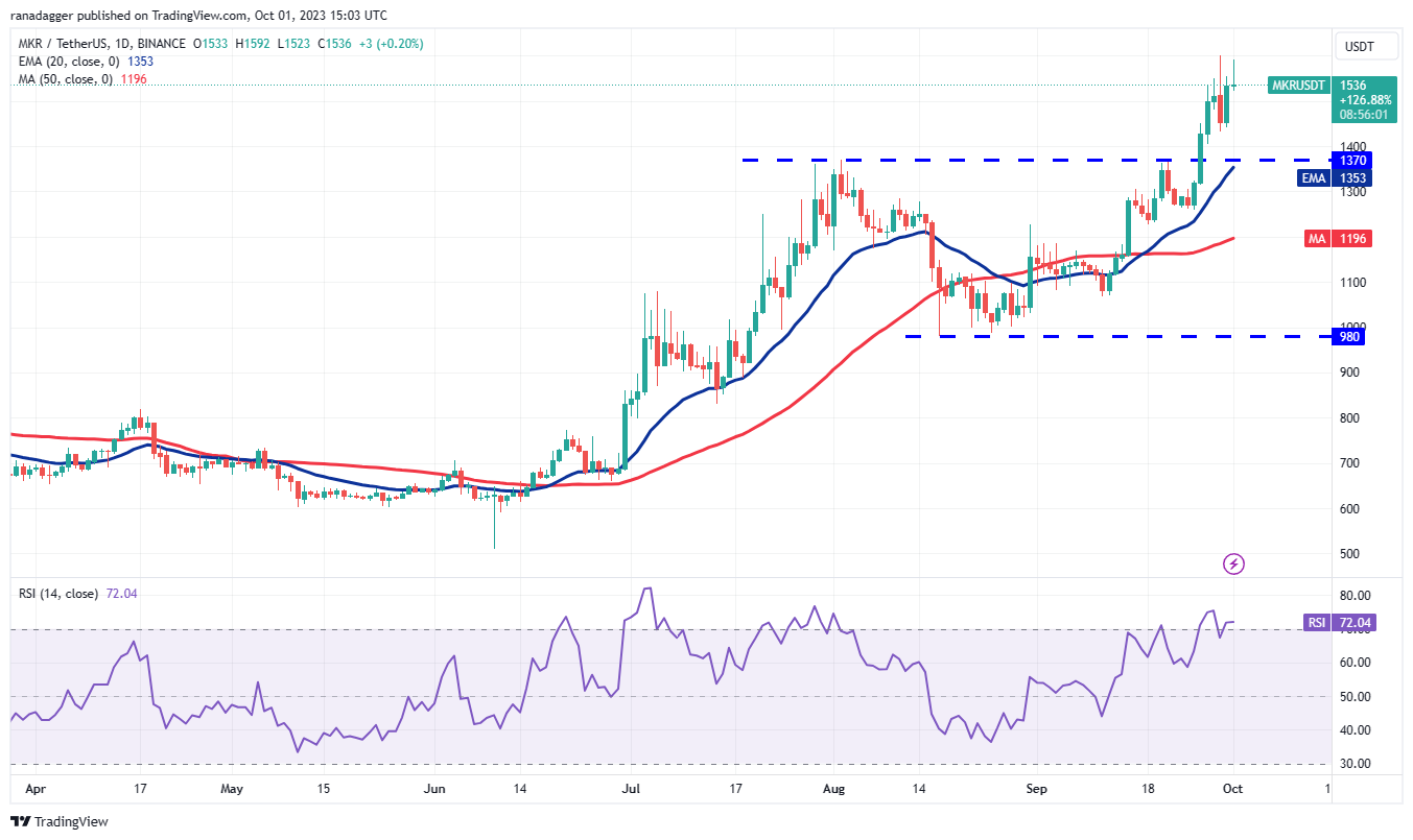 Maker (MKR) broke and closed above $1,370 on Sep. 26, indicating the start of a new uptrend. When an asset is in an uptrend, traders tend to buy on dips.