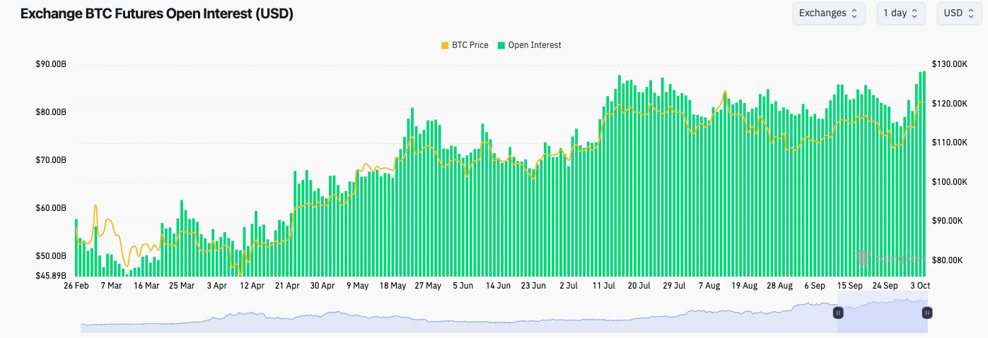CoinGlass data put total futures OI across exchanges at a record $88.7 billion on the day.