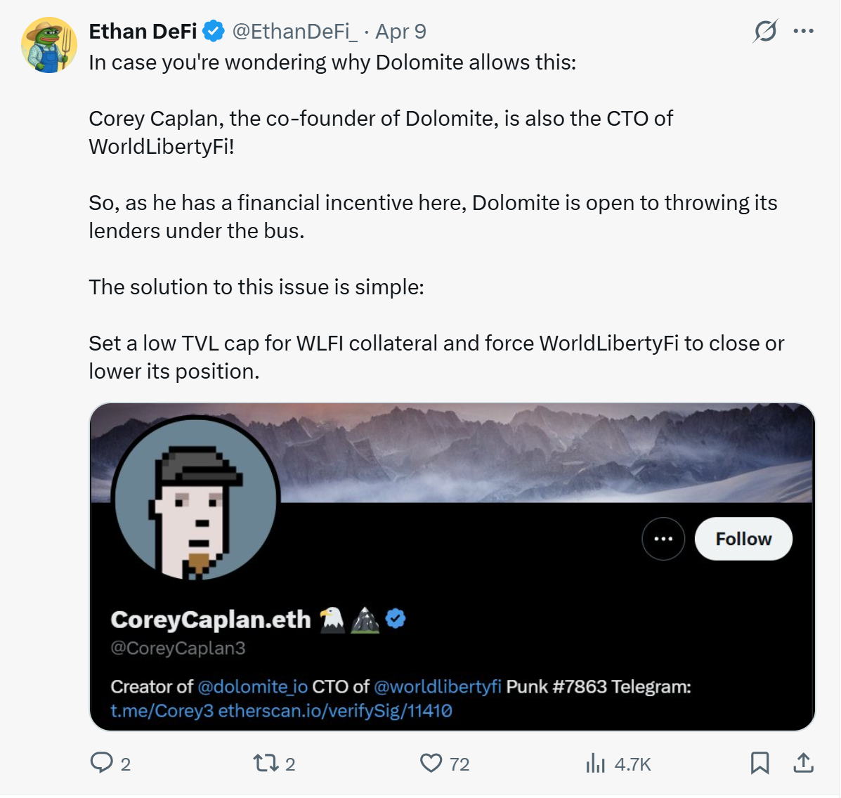 “WLFI has almost a $10 billion FDV, but it is not an extremely liquid asset,” one user wrote on X. “So imagine what would happen if 5% of WLFI’s total supply would suddenly need to be sold to liquidate the position,” he added.