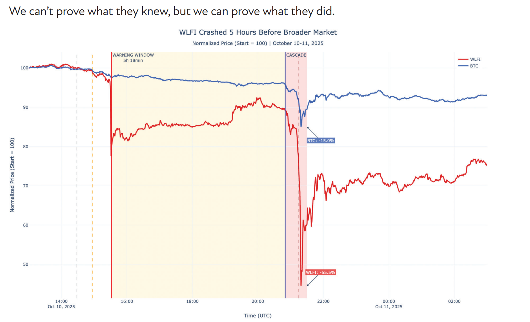 Amberdata found that WLFI began a sharp decline more than five hours before the broader market downturn. At the time, Bitcoin was still trading near $121,000 and showed little immediate stress.