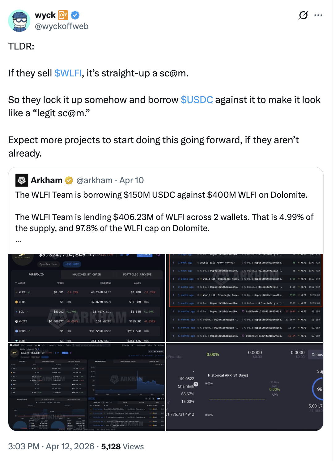 On-chain data from Arkham Intelligence show wallets linked to the project deposited roughly 3–5 billion WLFI tokens—largely illiquid—as collateral on Dolomite to borrow about $75 million in stablecoins, including USD1 and USDC.