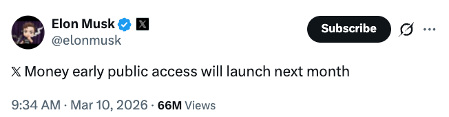 Still, Musk said in March that X Money would launch in April.