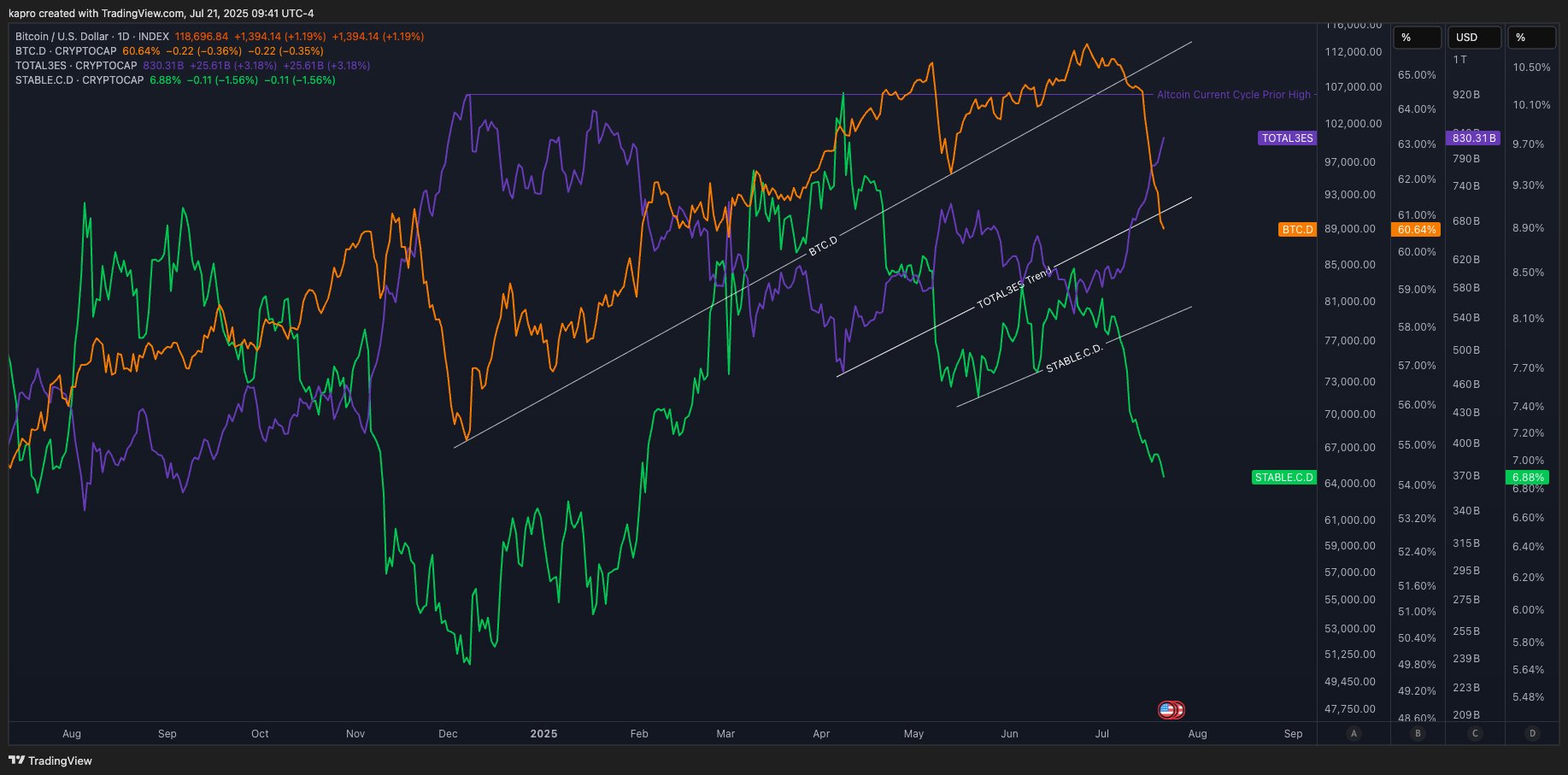 “This chart illustrates the rotation from $BTC and Stables into Alts,” he told followers on X.