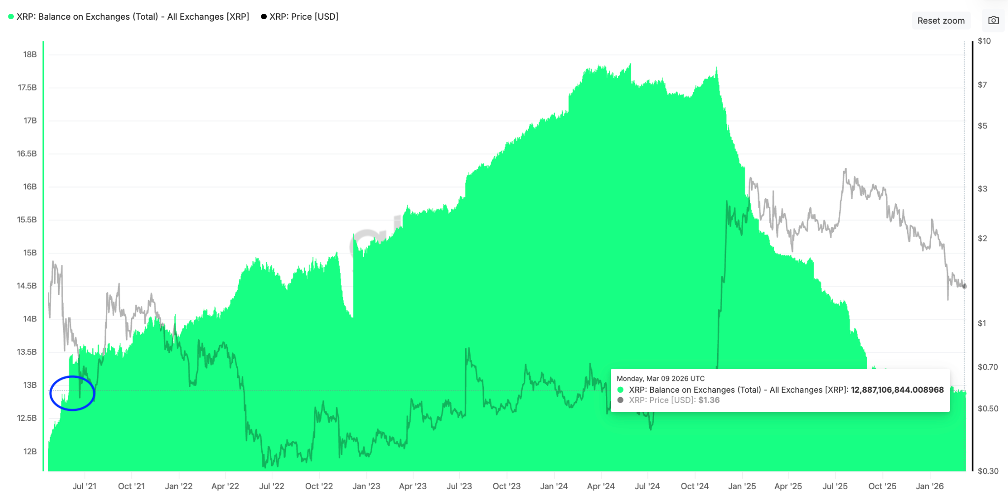 The XRP balance on exchanges dropped to 12.8 billion on Friday, levels last seen in May 2021.