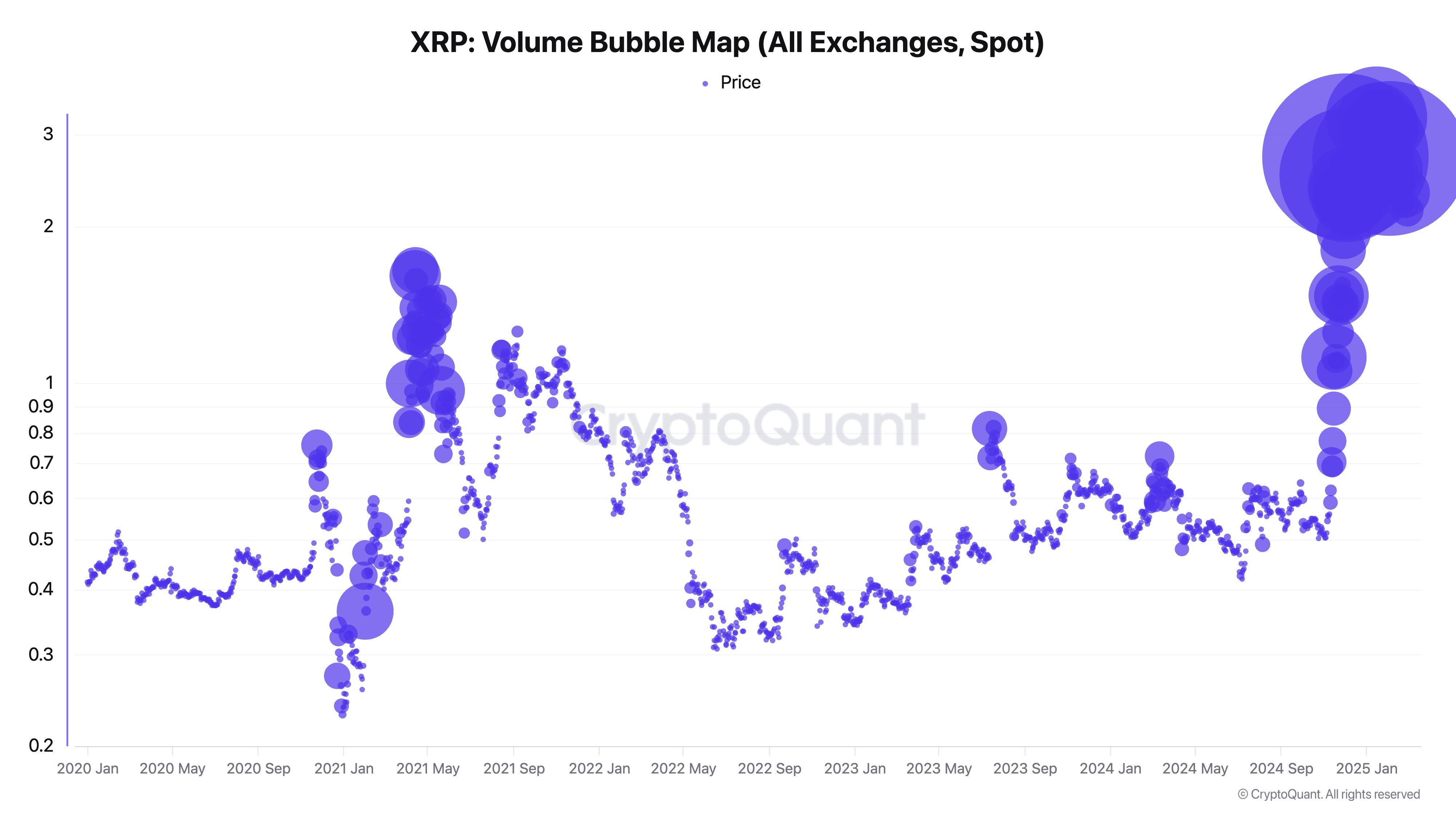 With XRP currently 30% below its all-time high, CryptoQuant founder Ki-Young Ju implied that large XRP addresses are potentially cashing out. With the help of XRP’s volume bubble map he highlighted heightened activity between $2 and $3 over the past month.