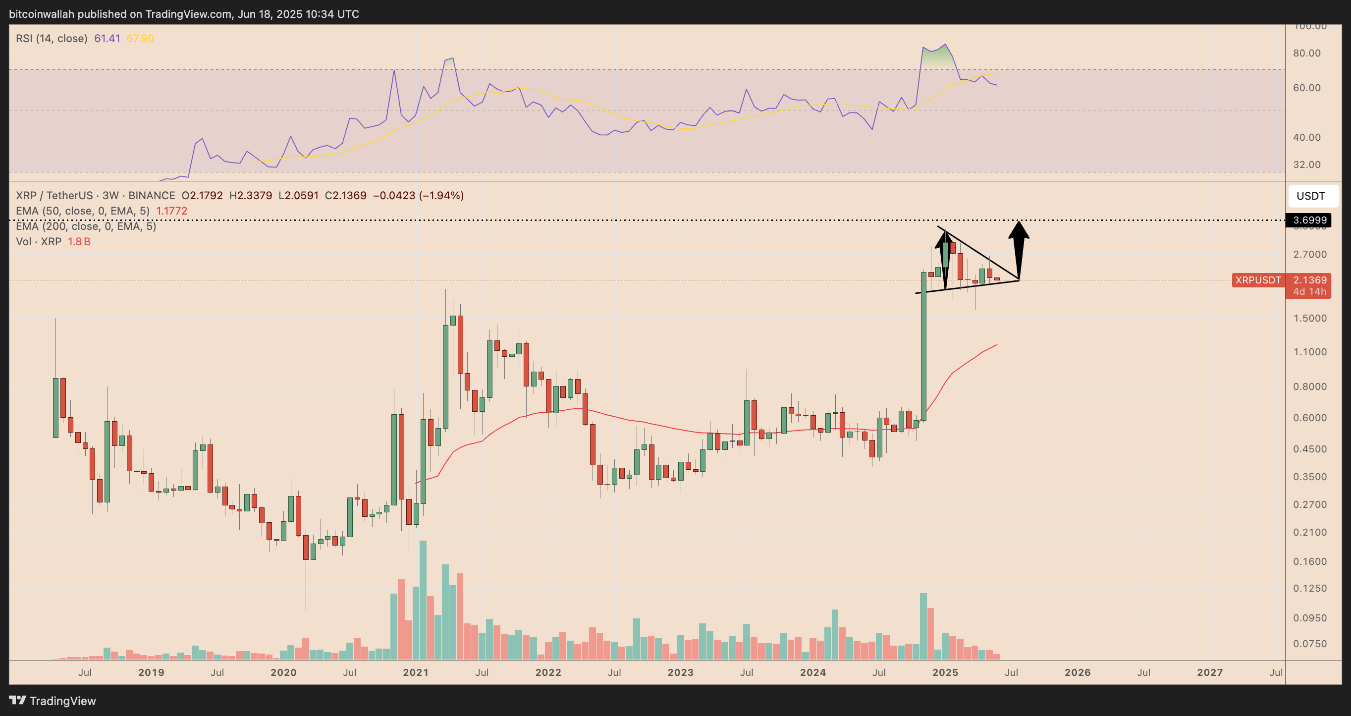 When measured from the triangle’s apex point, XRP’s breakout target is around $3.70, or 75% gains from current levels, if the 2017 breakout from a similar pattern is any indication.