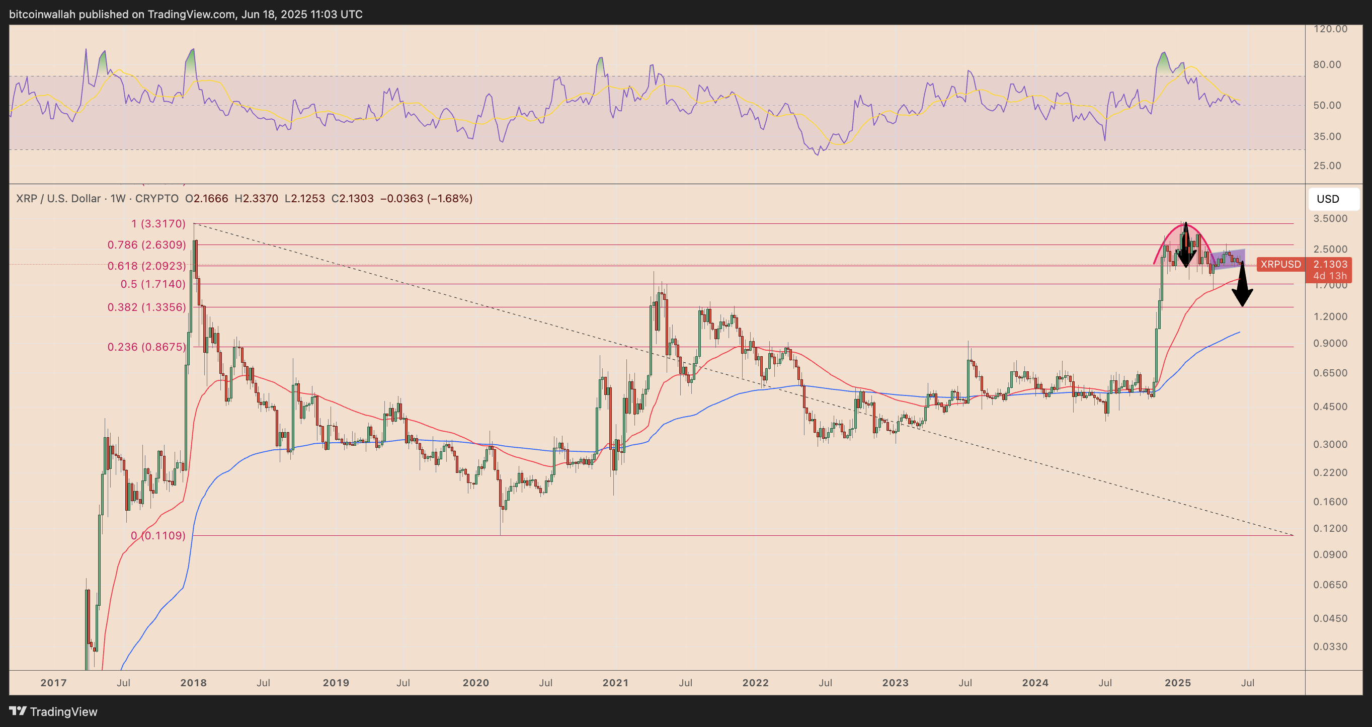 If confirmed, the setup projects a potential decline toward the 0.382 Fibonacci retracement level near $1.33, aligning with a key 0.382 Fibonacci retracement line support that served as a resistance during the 2021 XRP correction.