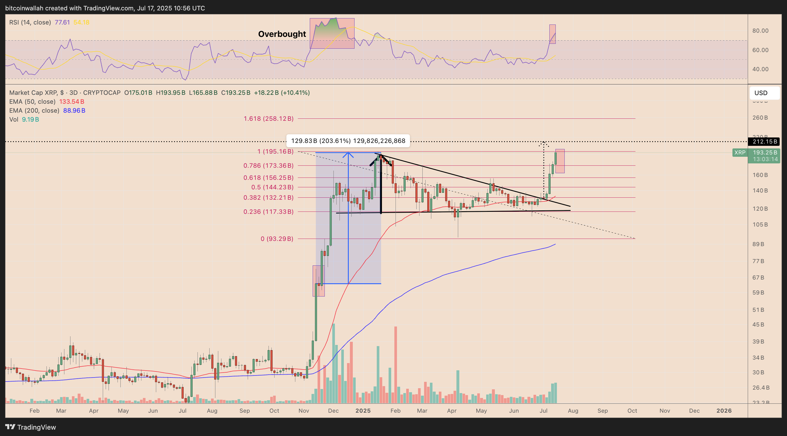 A successful push beyond $212 billion would open the door to the 1.618 Fibonacci extension level, aligning approximately $258 billion, up 33% from current levels, by the year’s end.