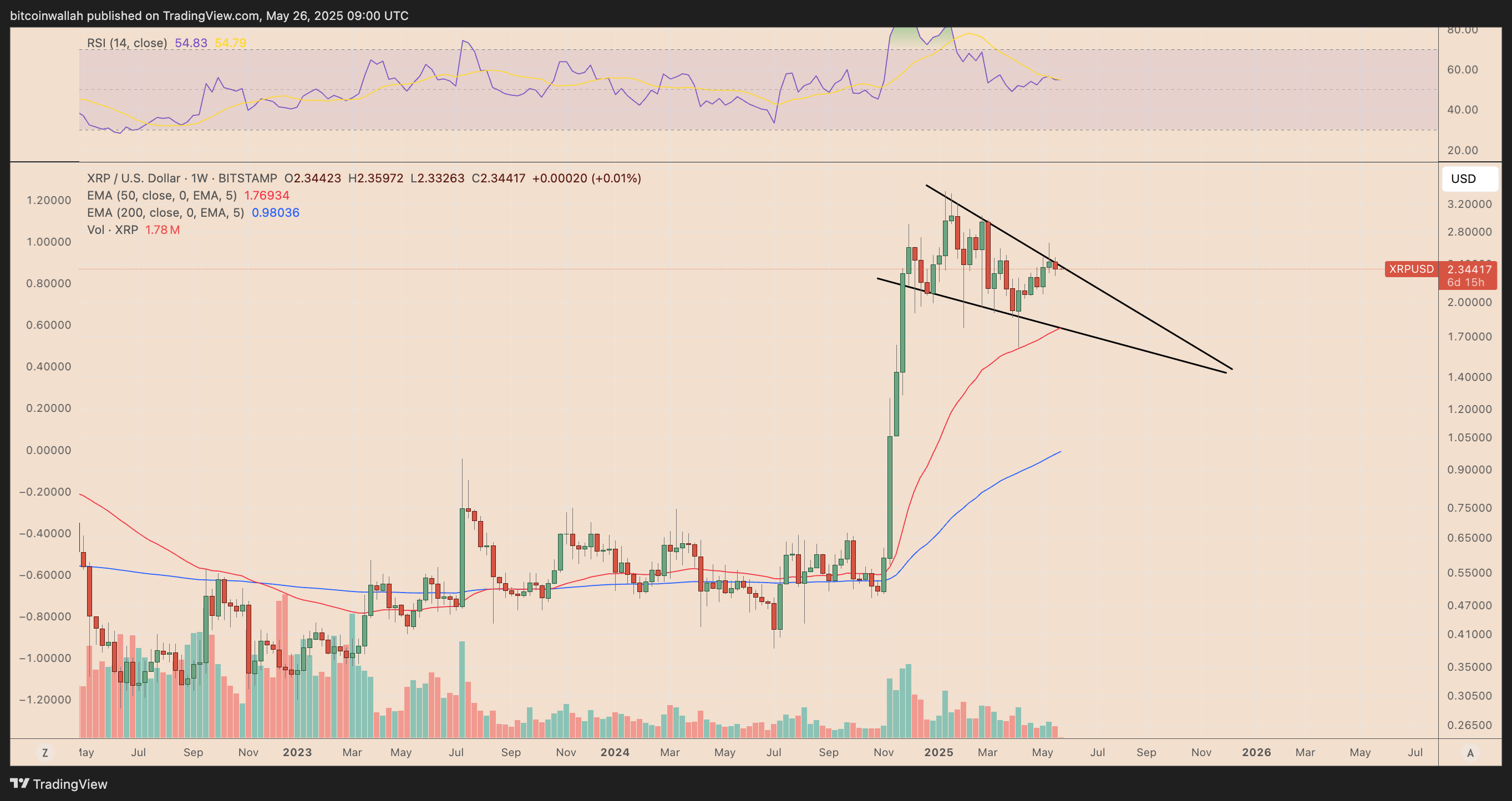XRP’s weekly chart shows the price consolidating within a falling wedge pattern.