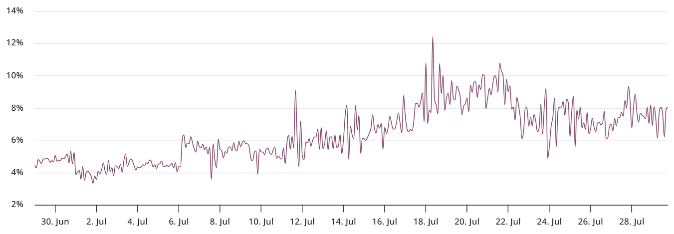 The chart above clearly shows that leverage fueled the 68.7% rally between July 1 and July 18, when XRP climbed to $3.66 from $2.17. Aggregate XRP futures open interest reached an all-time high of $11.2 billion on July 18, before falling to the current $8.8 billion level—a 21% drop in US dollar terms. This decline has prompted speculation that some investors may have shifted their focus elsewhere.