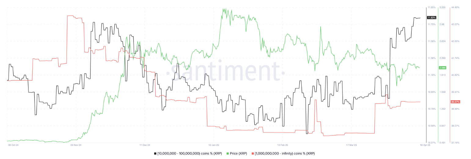 XRP whale addresses holding between 10 million and 100 million XRP (black line) have increased sharply since April 1, according to data from Santiment.