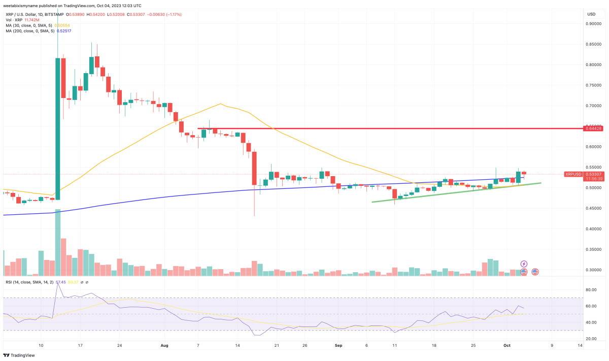 The coin has settled (for now) at a price of $0.533736, representing a 4.5% gain in 24 hours and a 6% jump in a week and a month, with the token also having risen by 57% since the beginning of the year.