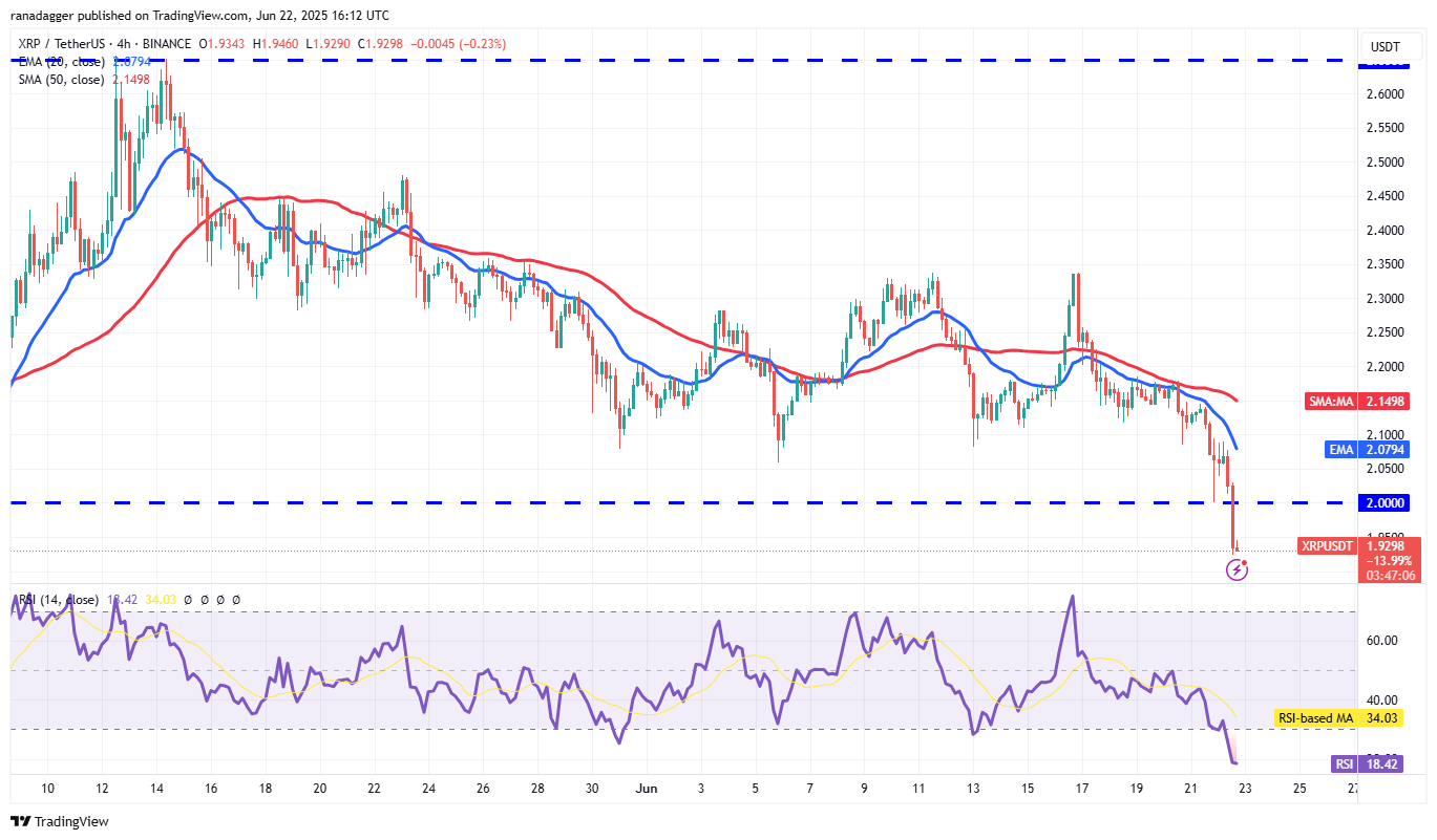 The bulls tried to start a bounce off the $2 support, but the bears aggressively sold near the 20-EMA on the 4-hour chart. The price turned down and broke below the $2 support, pulling the RSI into the oversold territory. That suggests a relief rally is possible in the short term.