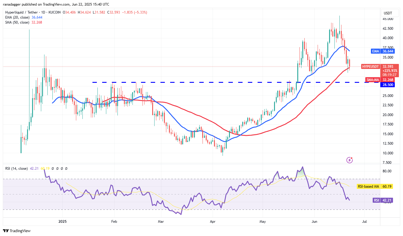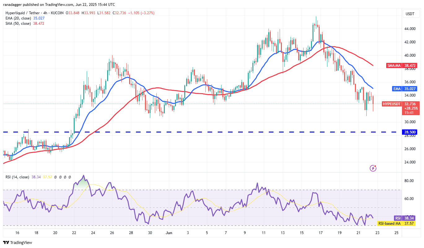 The bulls held the 50-day SMA ($32.26) on Saturday, but the bounce has been sold into. That increases the possibility of a break below the 50-day SMA. The HYPE/USDT pair could descend to the breakout level of $28.50.
