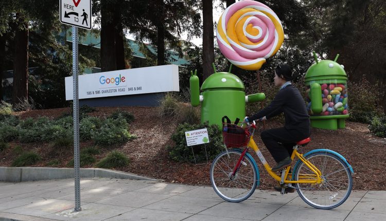 A sign is posted in front of a Google office on January 30, 2024 in Mountain View, California.