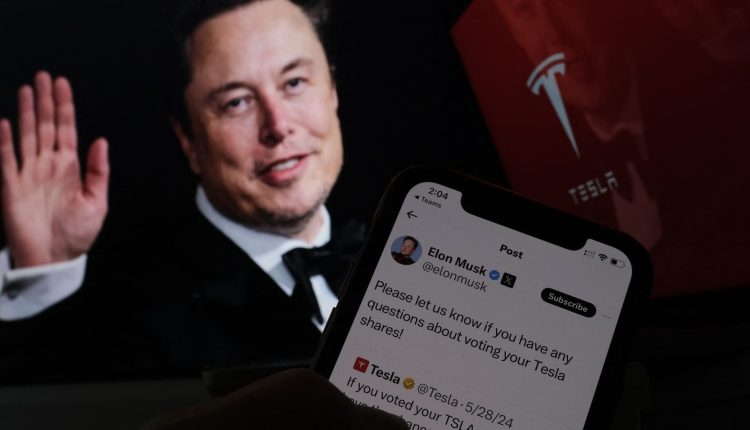 This illustration image created on June 12, 2024 in Los Angeles, shows South African businessman Elon Musk’s campaign launched on X ahead of Tesla shareholders meeting in front of his picture on a screen. Electric vehicle company Tesla kept up the campaign to win last-minute votes ahead of the June 13 shareholder meeting that will weigh in on CEO Elon Musk’s giant compensation package.