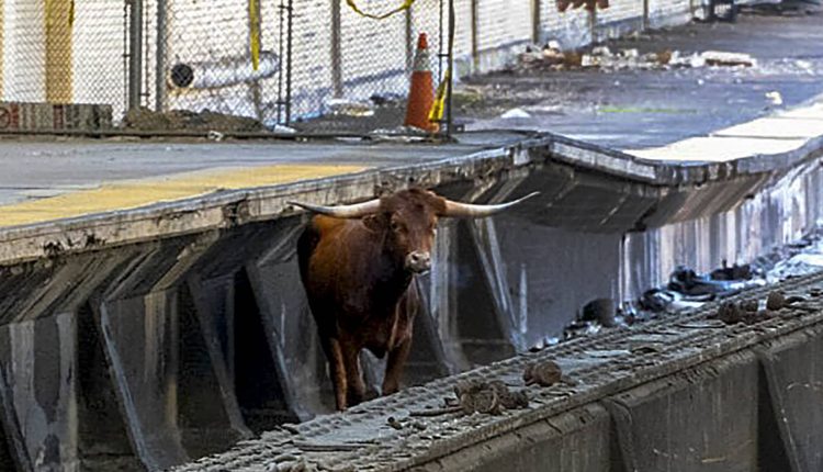 A bull stands on the tracks at Newark Penn Station in Newark, New Jersey, on Dec. 14, 2023.