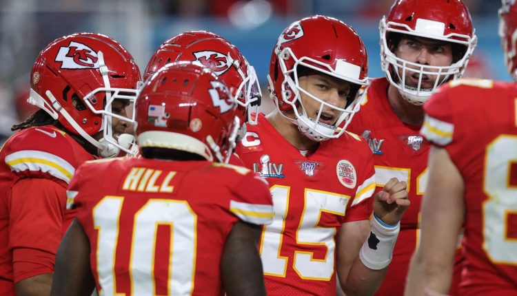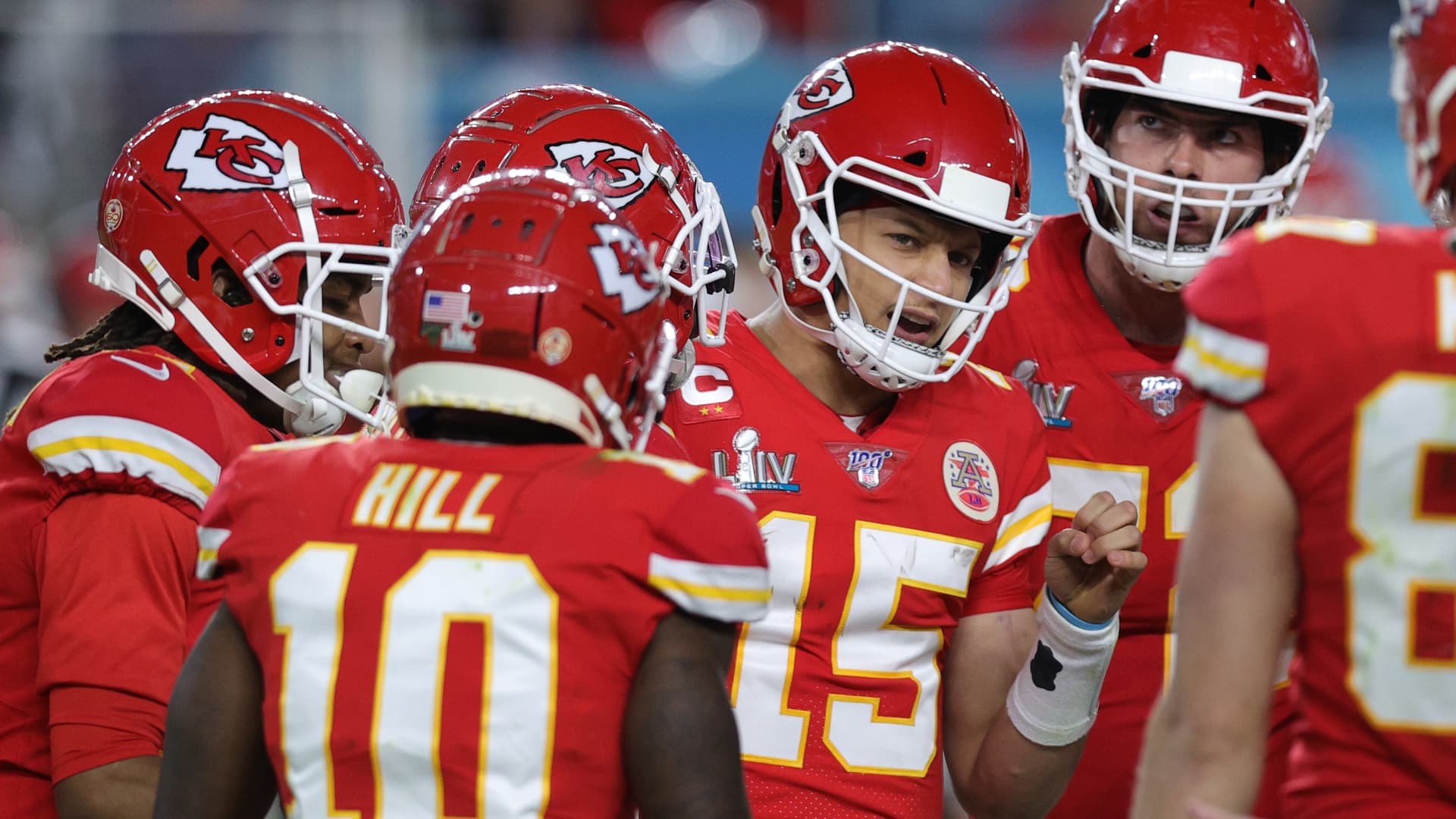 Patrick Mahomes #15 of the Kansas City Chiefs huddles with his team against the San Francisco 49ers during the third quarter in Super Bowl LIV at Hard Rock Stadium on February 02, 2020 in Miami, Florida.