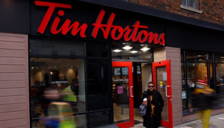 A person walks out of a Tim Hortons store on Yonge St. in Toronto.