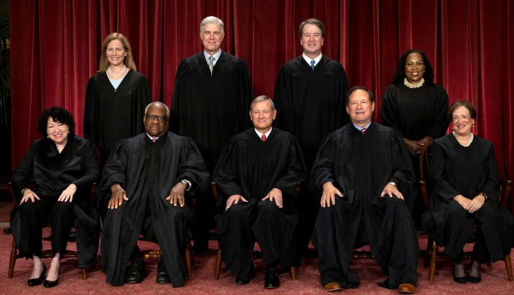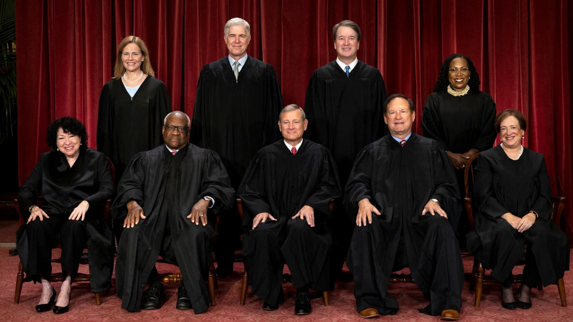 U.S. Supreme Court justices Amy Coney Barrett, Neil M. Gorsuch, Brett M. Kavanaugh, and Ketanji Brown Jackson, back row, left to right; and Sonia Sotomayor, Clarence Thomas, Chief Justice John G. Roberts, Jr., Samuel A. Alito, Jr. and Elena Kagan, front row, left to right, Oct. 7, 2022.