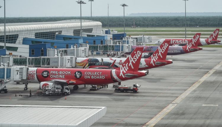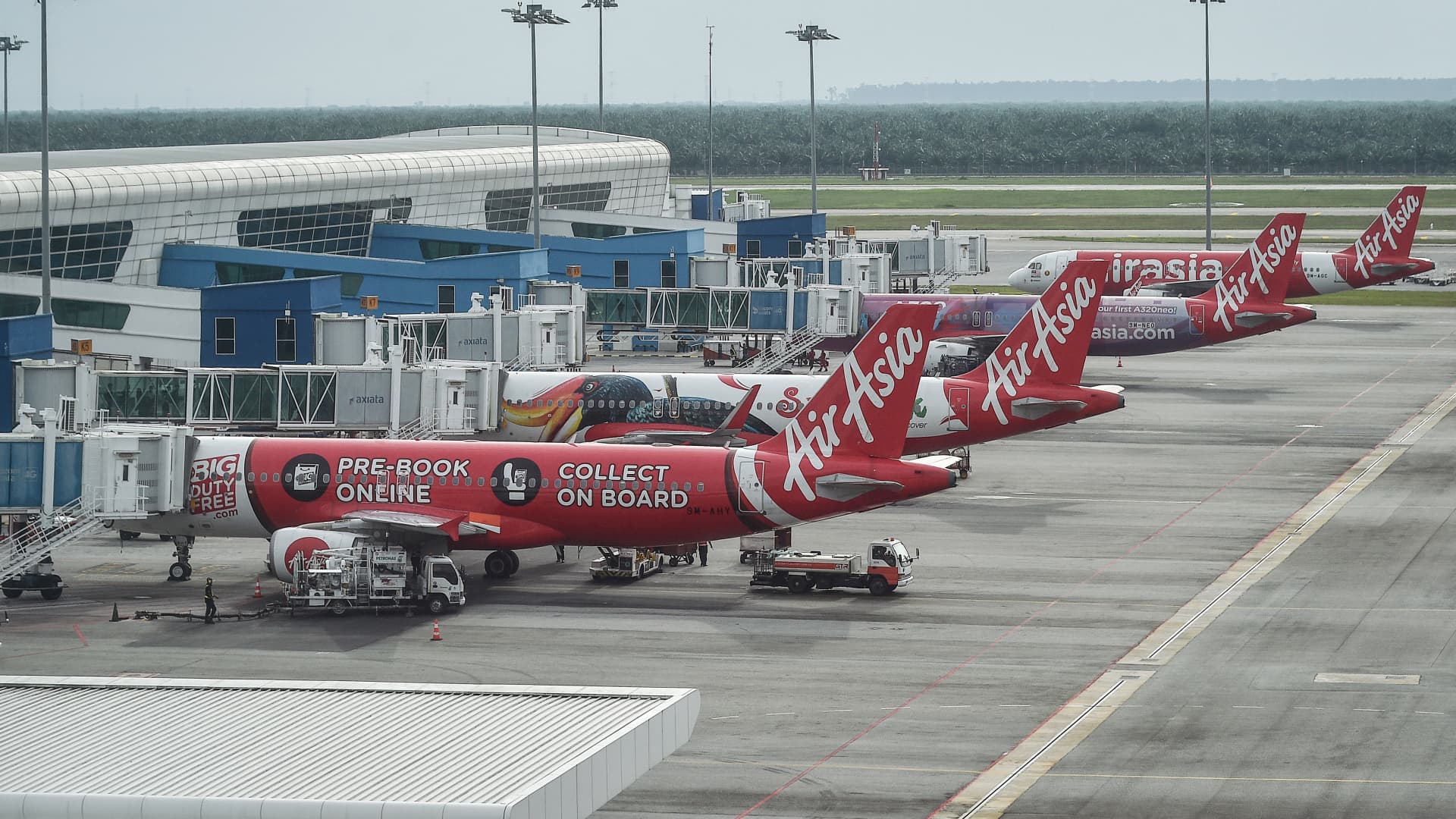 AirAsia airplanes are pictured on the tarmac at Kuala Lumpur International Airport in Sepang on January 8, 2024. Malaysian conglomerate Capital A intends to sell its budget carrier business to medium- to long-haul affiliate AirAsia X in a major consolidation of the country’s airline industry.
