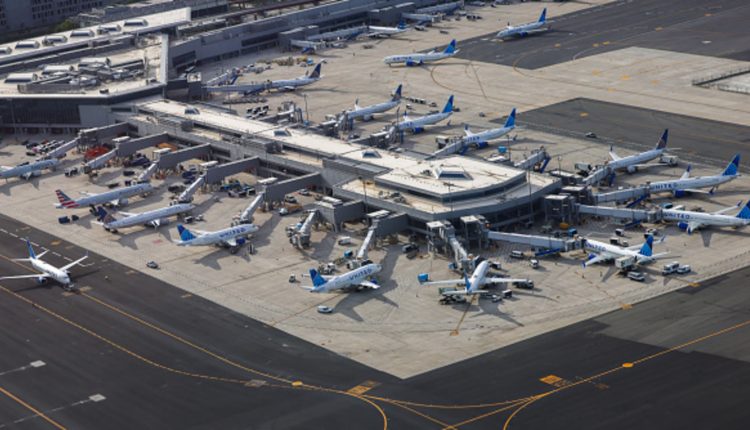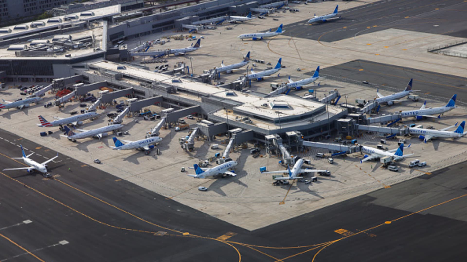 Aerial view of United Airlines passenger planes docked in a terminal of Newark Airport in Newark, New Jersey, on May 11, 2024.