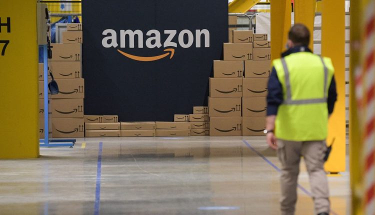 An US giant Amazon employee passes by its logo on the opening day of the new distribution center in Augny, eastern France, on September 23, 2021. (Photo by SEBASTIEN BOZON / AFP) (Photo by SEBASTIEN BOZON/AFP via Getty Images)