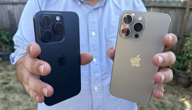 The iPhone 15 Pro on the left, the iPhone 15 Pro Max on the right.