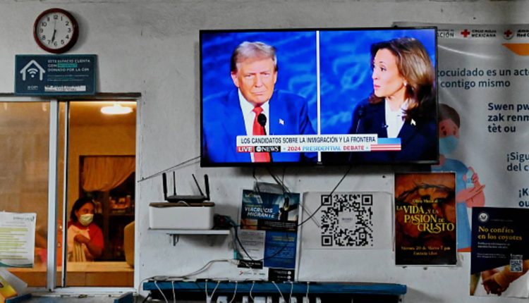 The first debate between Vice President Kamala Harris and former President Donald Trump is shown on television at the Juventud 2000 migrant shelter in Tijuana, Mexico, on Sept. 10, 2024. Immigration has been a hot topic throughout the presidential campaign.
