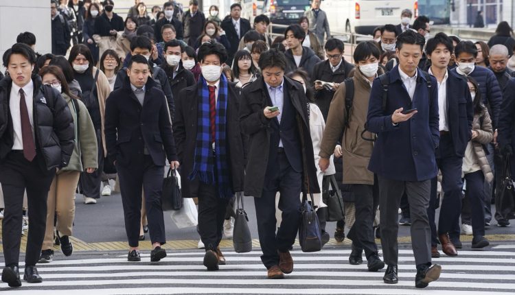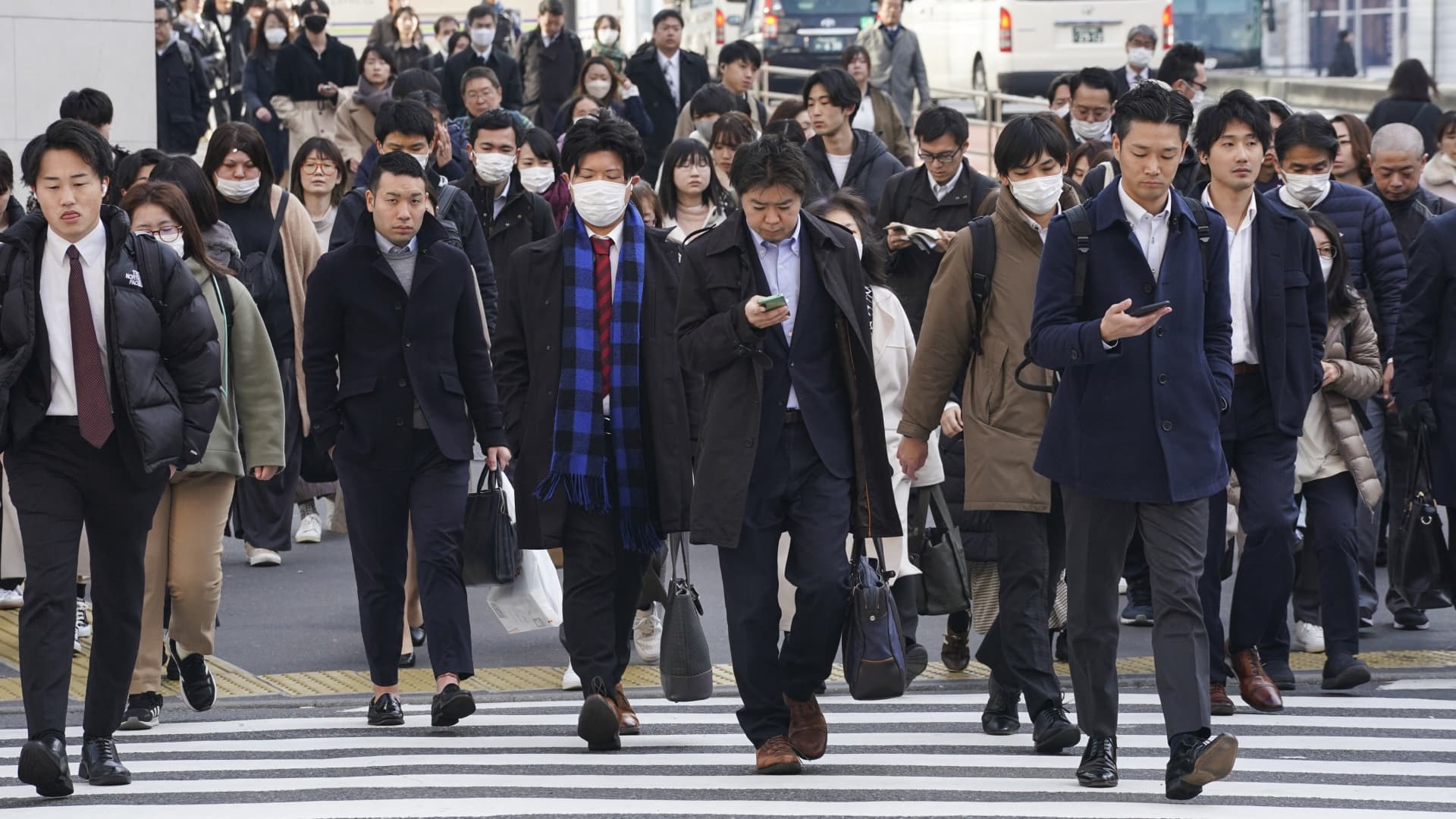 People commuting to work in the morning cross a pedestrian crossing in Tokyo on February 15, 2024.