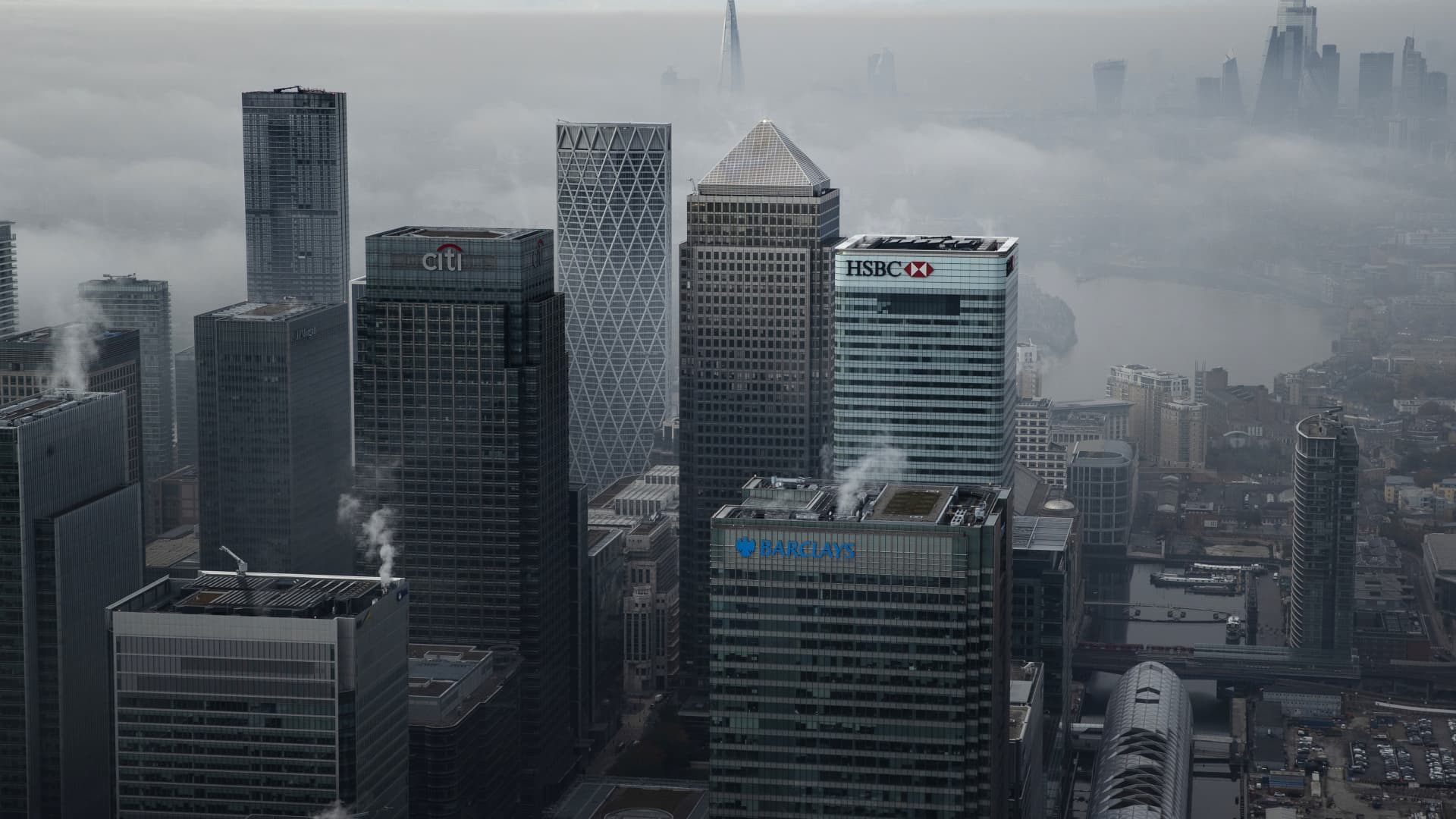 LONDON – Nov. 5, 2020: Fog shrouds the Canary Wharf business district including global financial institutions Citigroup Inc., State Street Corp., Barclays Plc, HSBC Holdings Plc and the commercial office block No. 1 Canada Square.