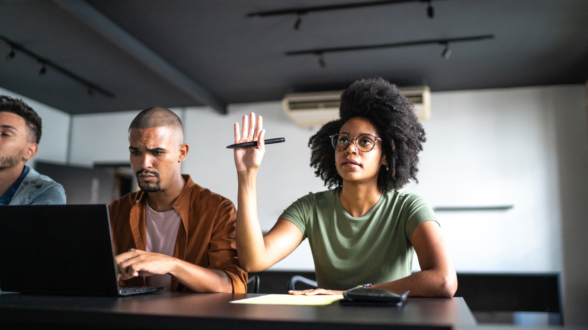 Woman with hands raised in the classroom