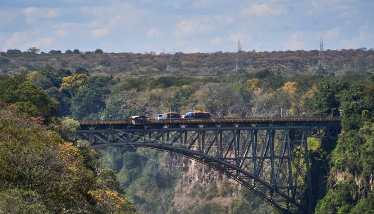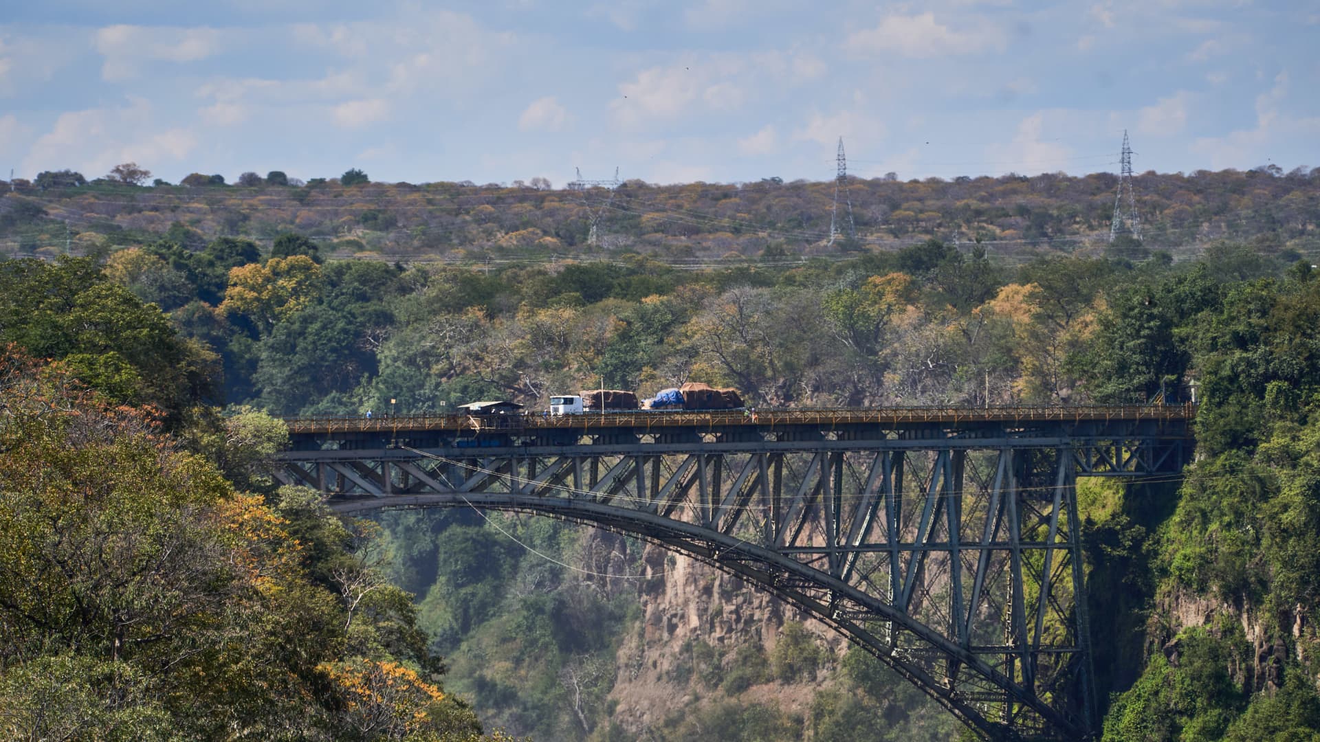 A truck makes its way over the Victoria Falls bridge, spanning over the Zambezi River, linking Zambia and Zimbabwe, in Livingstone, Zambia, on Sunday, May 8, 2022.