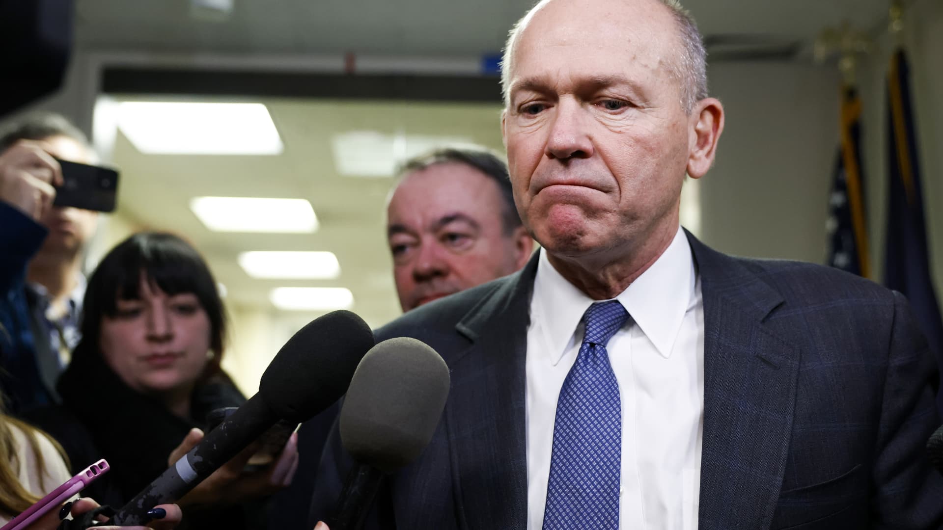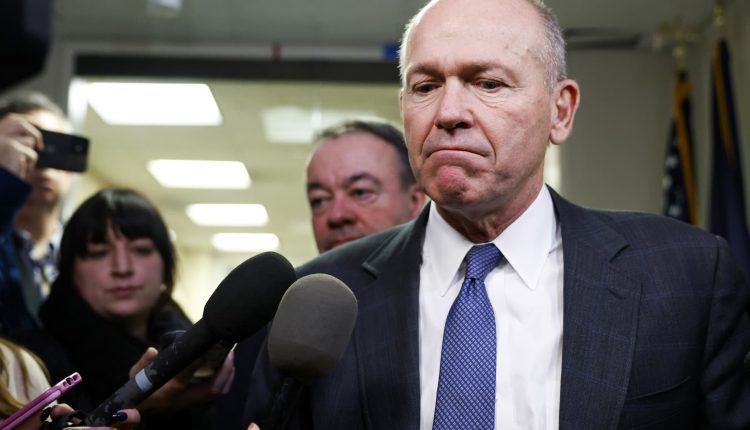 Boeing CEO Dave Calhoun speaks to reporters as he departs from a meeting at the office of Sen. Mark Warner (D-VA) on Capitol Hill January 24, 2024 in Washington, DC.
