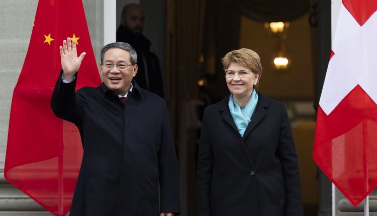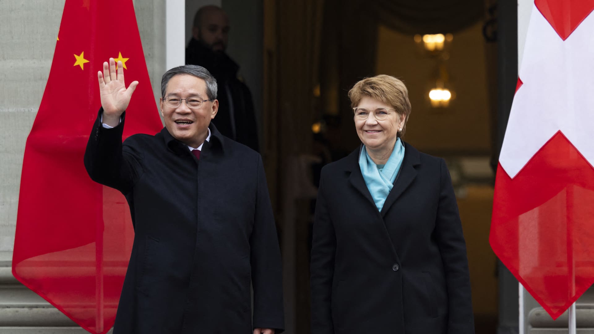 China’s Prime Minister Li Qiang (L) waves as Swiss President Viola Amherd looks on during an official visit in Kehrsatz, near Switzerland’s administrative capital Bern on January 15, 2024. Li Qiang, is visiting Switzerland to attend the 54th World Economic Forum Annual (WEF) which is taking place from January 14-19 in Davos. (Photo by PETER KLAUNZER / POOL / AFP) (Photo by PETER KLAUNZER/POOL/AFP via Getty Images)