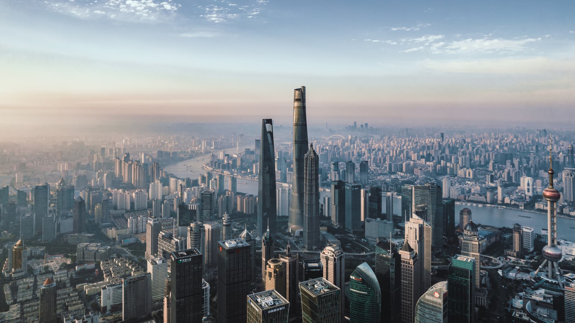 Drone point view of the Shanghai skyline at sunrise.