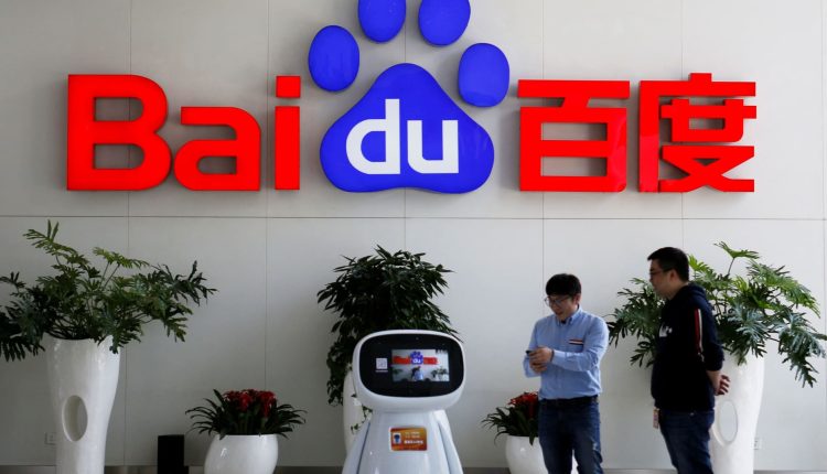 Men interact with a Baidu AI robot near the company logo at its headquarters in Beijing, China April 23, 2021.