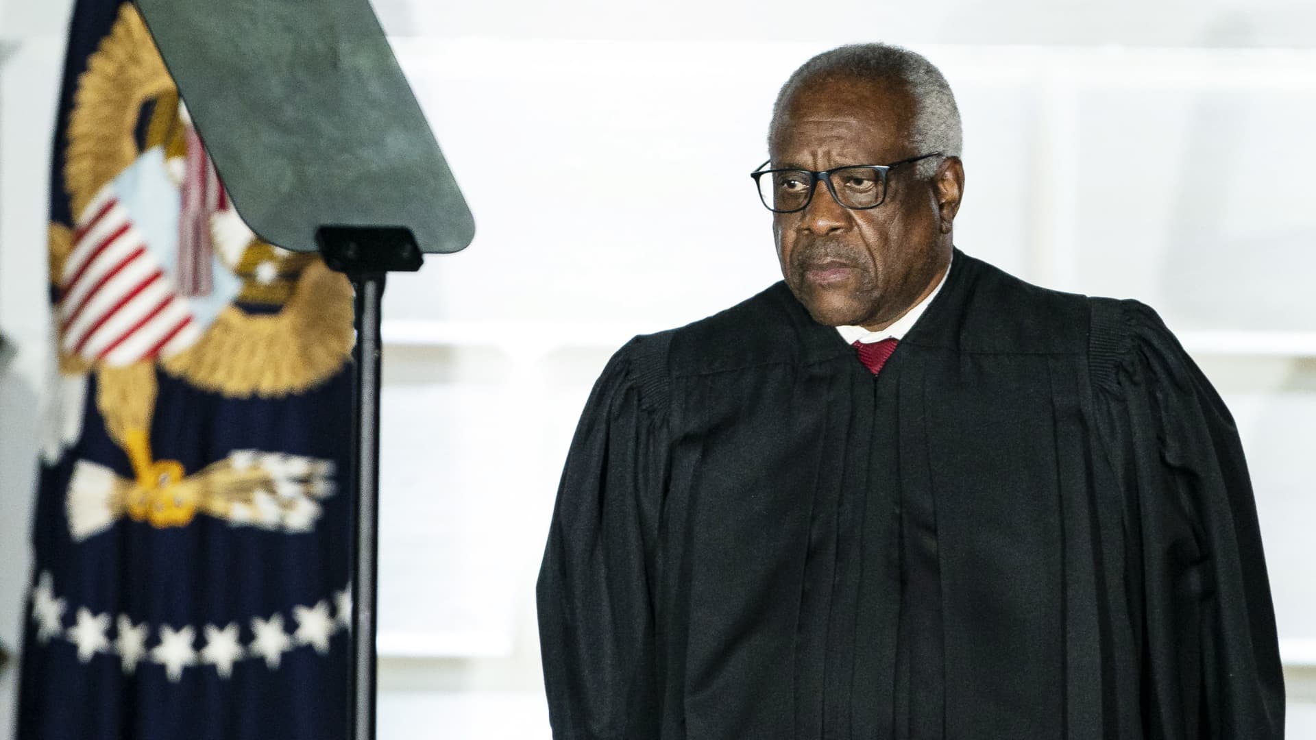 Clarence Thomas, associate justice of the U.S. Supreme Court, listens during a ceremony on the South Lawn of the White House in Washington, D.C., U.S., on Monday, Oct. 26, 2020.