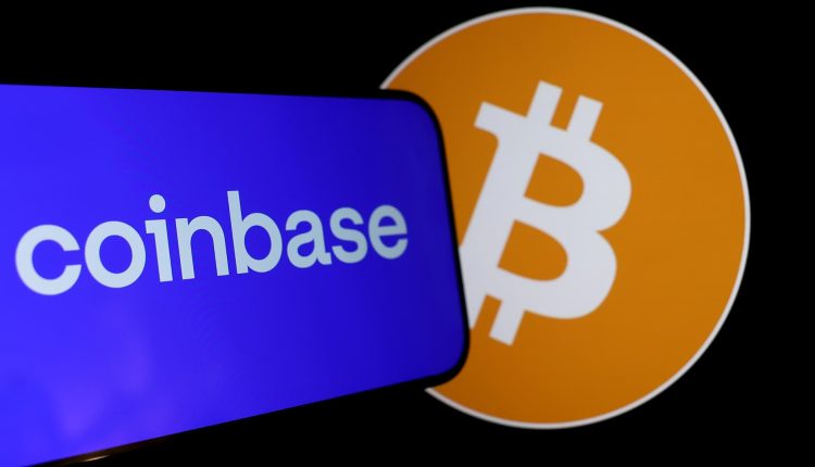 The Coinbase and bitcoin logos are displayed on a phone screen in San Anselmo, California, on Feb. 15, 2024.