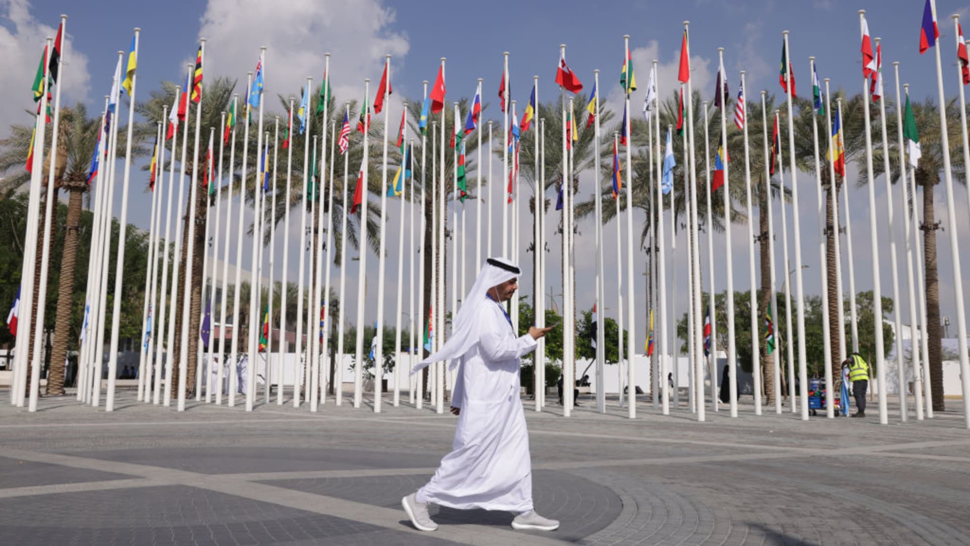 A man wearing a thawb walks past flags of nations participating in the UNFCCC COP28 Climate Conference the day before its official opening on November 29, 2023 in Dubai, United Arab Emirates.