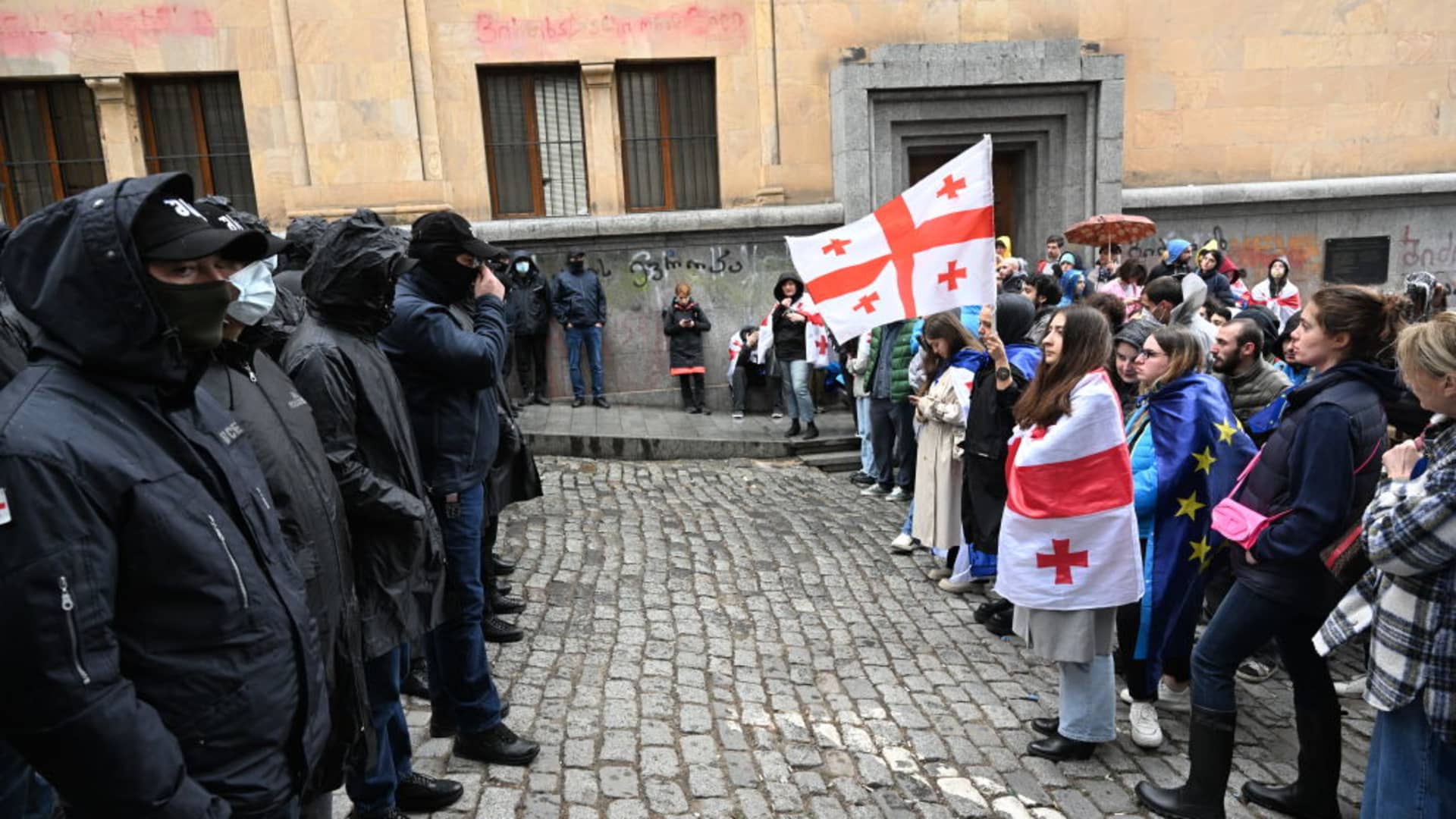 Georgian demonstrators protesting the controversial “foreign influence” bill stand in front of law enforcement officers blocking an area near the parliament building in Tbilisi on May 14, 2024.