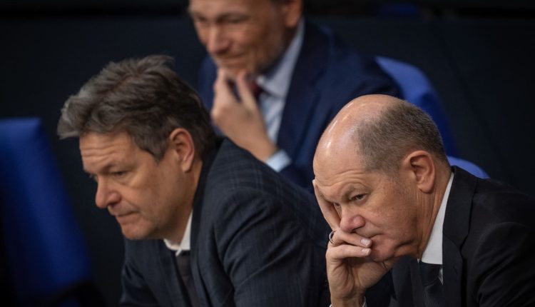 Federal Chancellor Olaf Scholz (SPD, r-l), Robert Habeck (Alliance 90/The Greens), Federal Minister for Economic Affairs and Climate Protection, and Christian Lindner (FDP), Federal Minister of Finance, follow the debate at the start of the budget week.