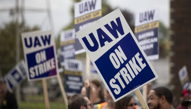 United Auto Workers members strike the General Motors Lansing Delta Assembly Plant on September 29, 2023 in Lansing, Michigan.
