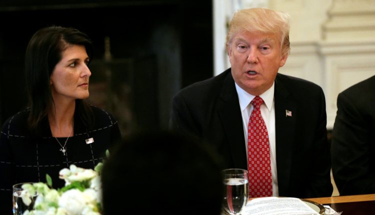 With U.S. Ambassador to the United Nations Nikki Haley at his side (L), U.S. President Donald Trump speaks during a working lunch with ambassadors of countries on the UN Security Council at the White House in Washington, U.S., April 24, 2017.