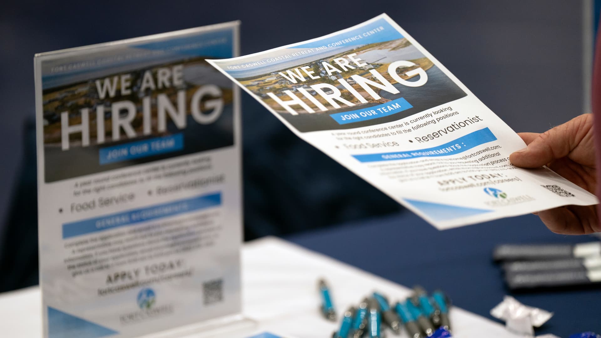 A jobseeker takes a flyer at a job fair at Brunswick Community College in Bolivia, North Carolina, US, on Thursday, April 11, 2024.